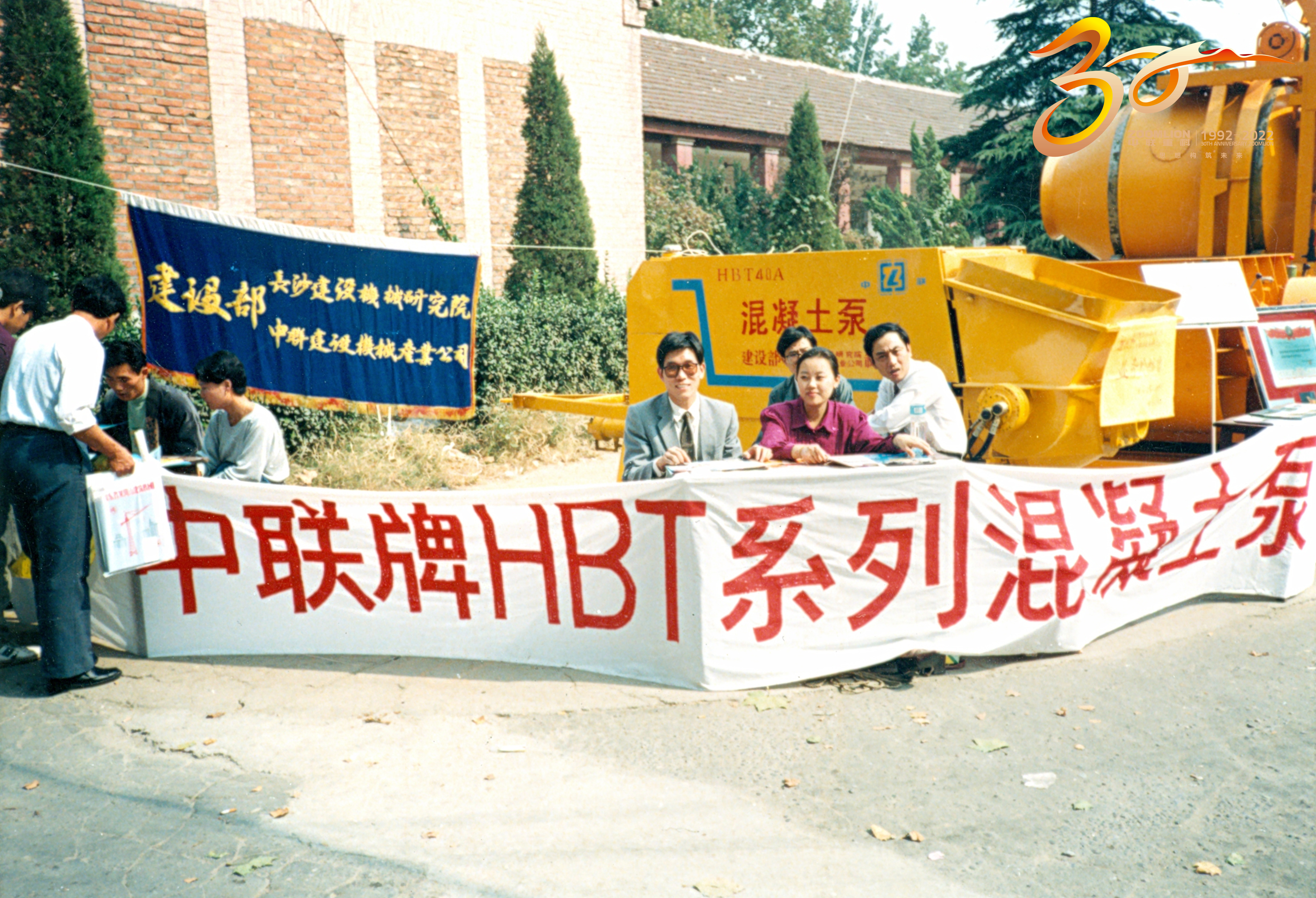 據(jù)親歷者回憶,他們打出了兩條橫幅。上面寫著“建設(shè)部、長沙建設(shè)機(jī)械研究院中聯(lián)建設(shè)機(jī)械產(chǎn)業(yè)公司”。當(dāng)時(shí),剛成立不久的中聯(lián)重科在業(yè)內(nèi)知名度不高,于是他們充分利用建設(shè)部、長沙建設(shè)機(jī)械研究院的權(quán)威性和知名度,打出這條橫幅來吸引客戶。此外,桌前的這條“中聯(lián)牌HBT系列混凝土泵”橫幅還是手寫上去的。